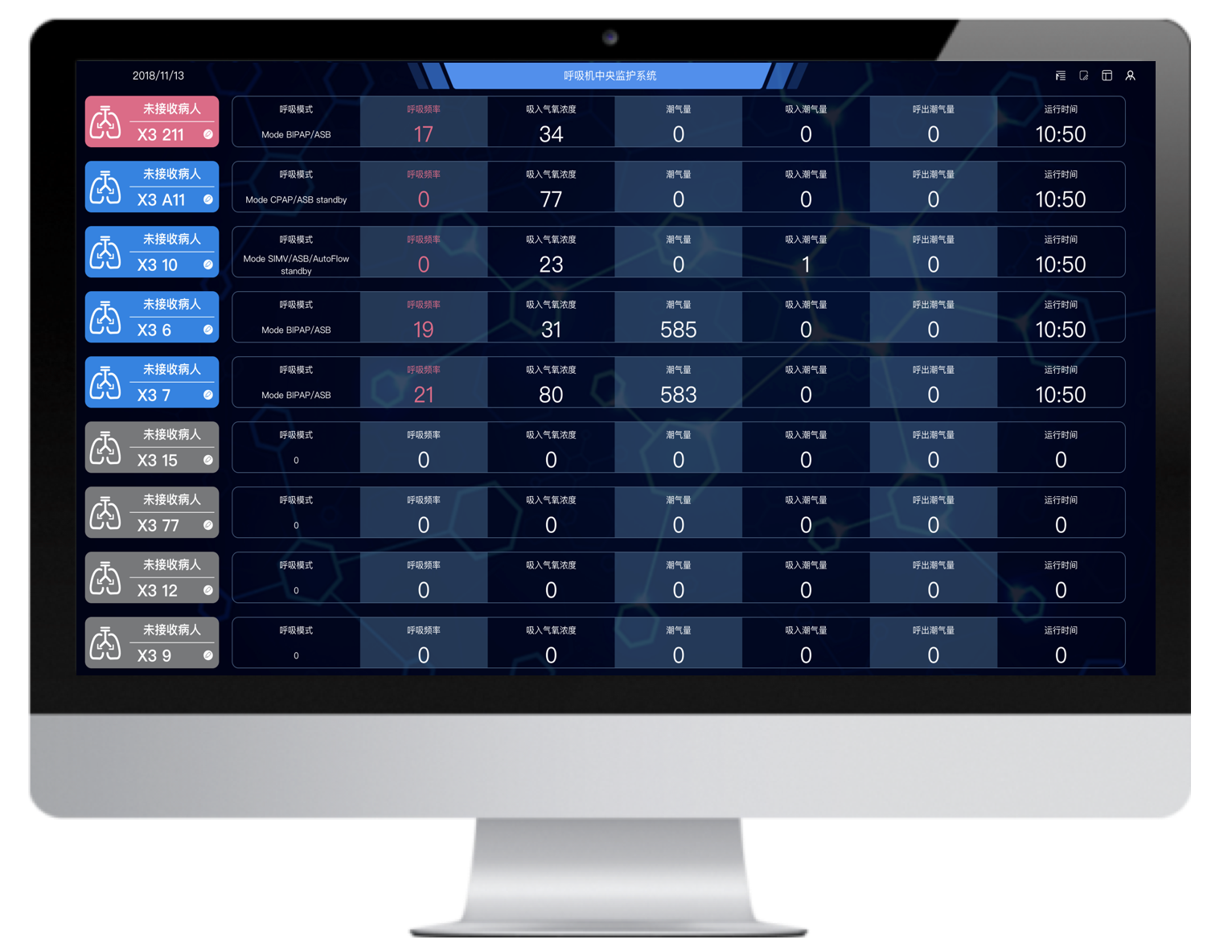 通過的最新的數據采集技術和網絡技術將多臺不同品牌的有創呼吸機聯網,并通過大屏實時集中呈現治療預設參數和監測參數,實現多臺集中監測、集中管理和數據存儲。